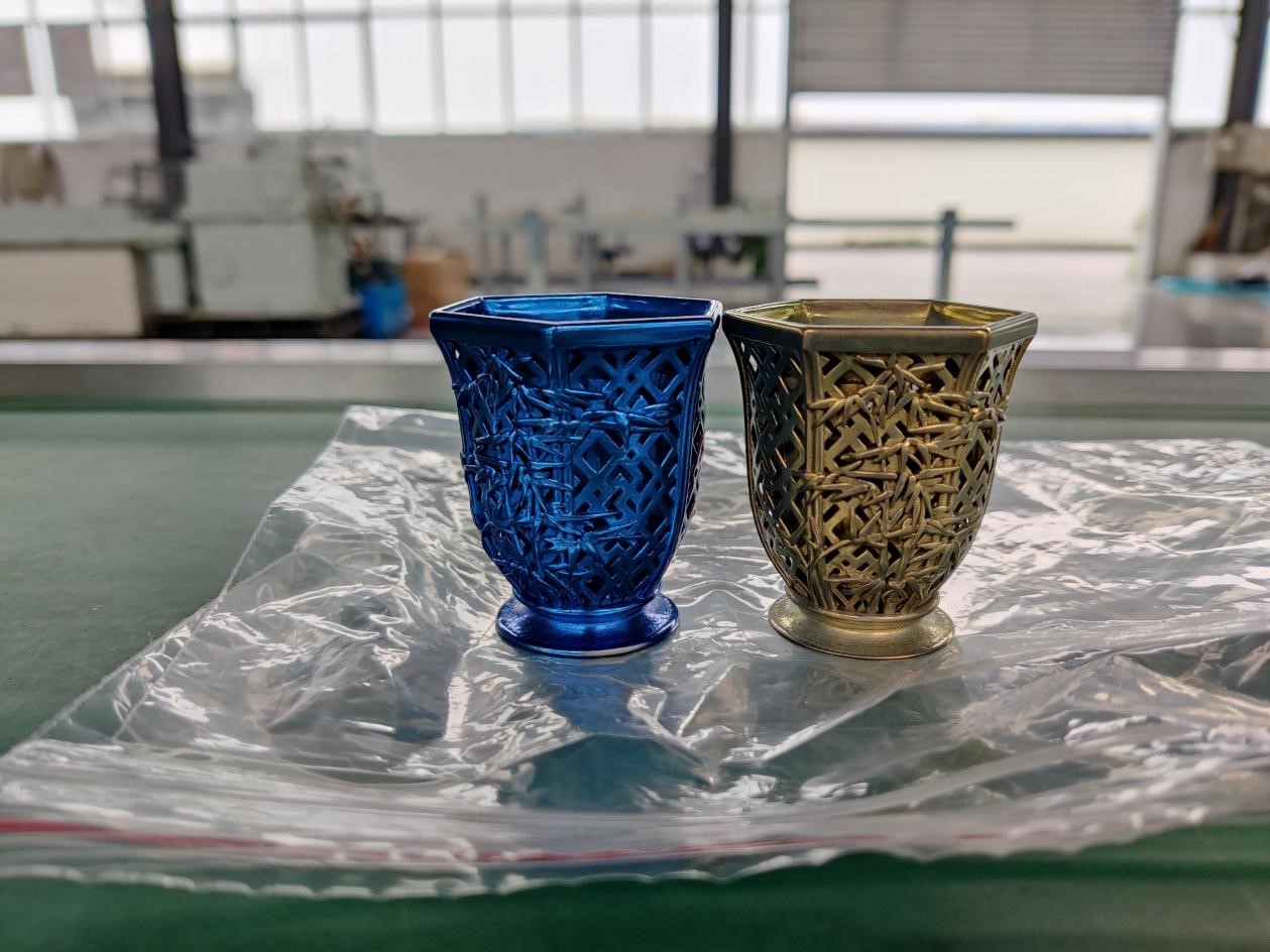产品特征:以纯钛为材料进行镂空夹层设计,在突显美观的同时体现了增材制造的技术优势,健康、隔热、保温、轻盈是它的特点,再赋予钛金属特有的表面着色工艺使它更具魅力。